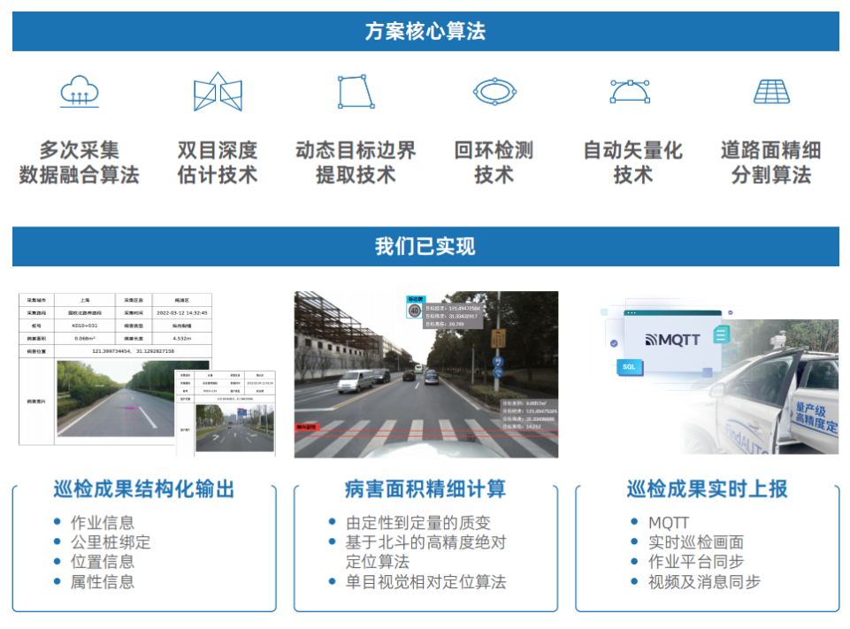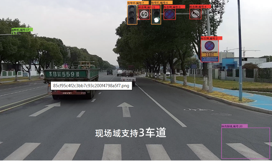 一次性完成公路表面病害及公路基础、附属设施“端侧联合智能识别",支持包括横向裂缝、纵向裂缝、网状裂缝、坑槽、条状修补、块状修补在内6大类公路表面病害,召回率和准确率均优于90%,同时支持包括交通信号灯、交通摄像头、交通标志牌在内,3大类8小类公路基础及附属设施,端侧召回率优于96%,准确率优于92%,边缘侧整体处理速度优于10帧/秒,巡检车速大于80公里/小时,巡检过程中不影响正常交通。