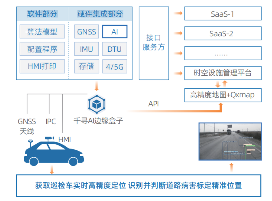详细信息| 询价留言品牌:千寻 型号:千寻驰观AI 加工定制:否 适用范围:道路 型号:千寻驰观AI 加工定制:否 千寻驰观AI道路病害智能巡检系统基于北斗高精度定位及计算机视觉技术打造的道路自动化巡检系统。整套系统包含轻量化车载采集平台及边缘智能算法引擎,能够支持公路表面病害及公路基础、附属设施的边缘侧智能识别,自动输出识别目标的高精度位置及公路表面病害的精确面积,提供面向业务需求的结构化结果并实时上报,为道路巡查和养护的降本提效,以及道路管理数字化水平的提升,提供重要的数据支撑。